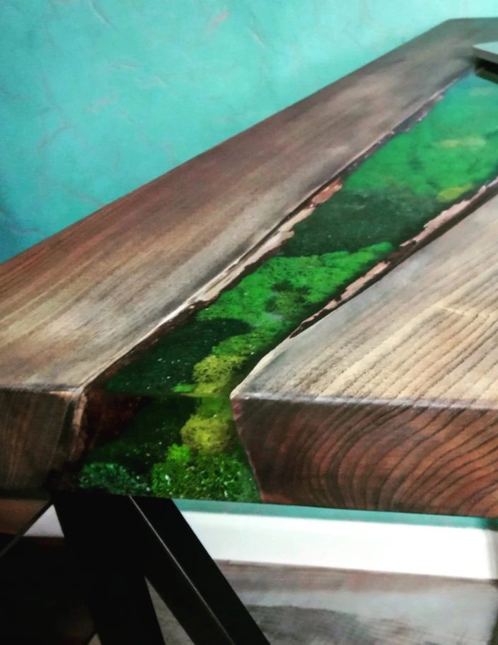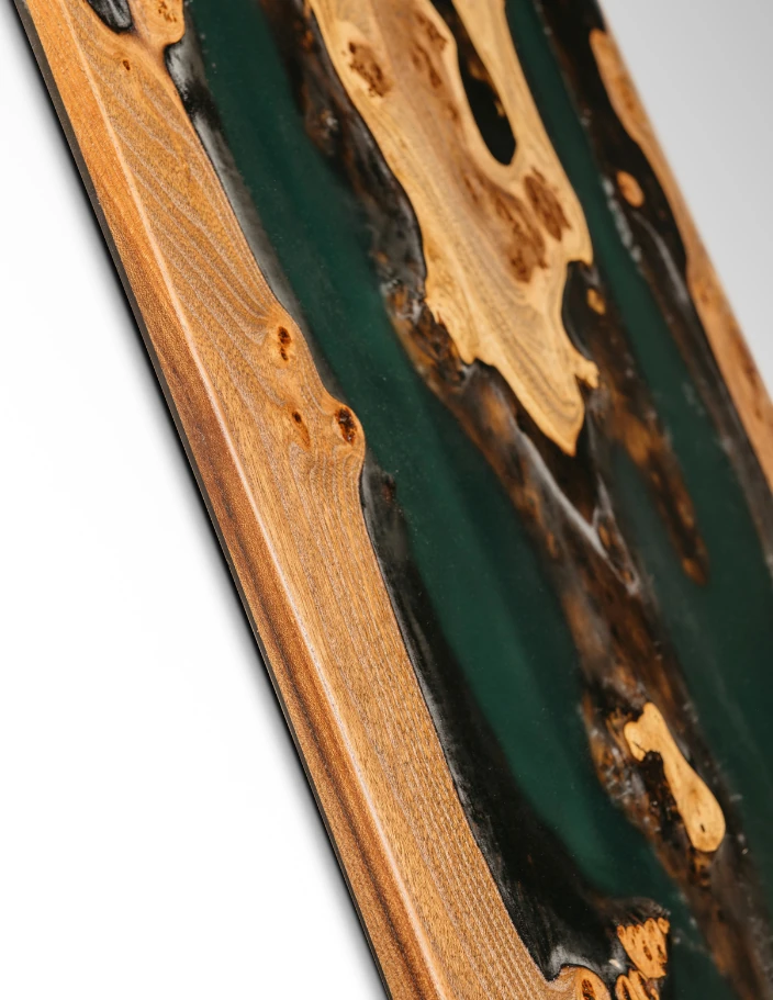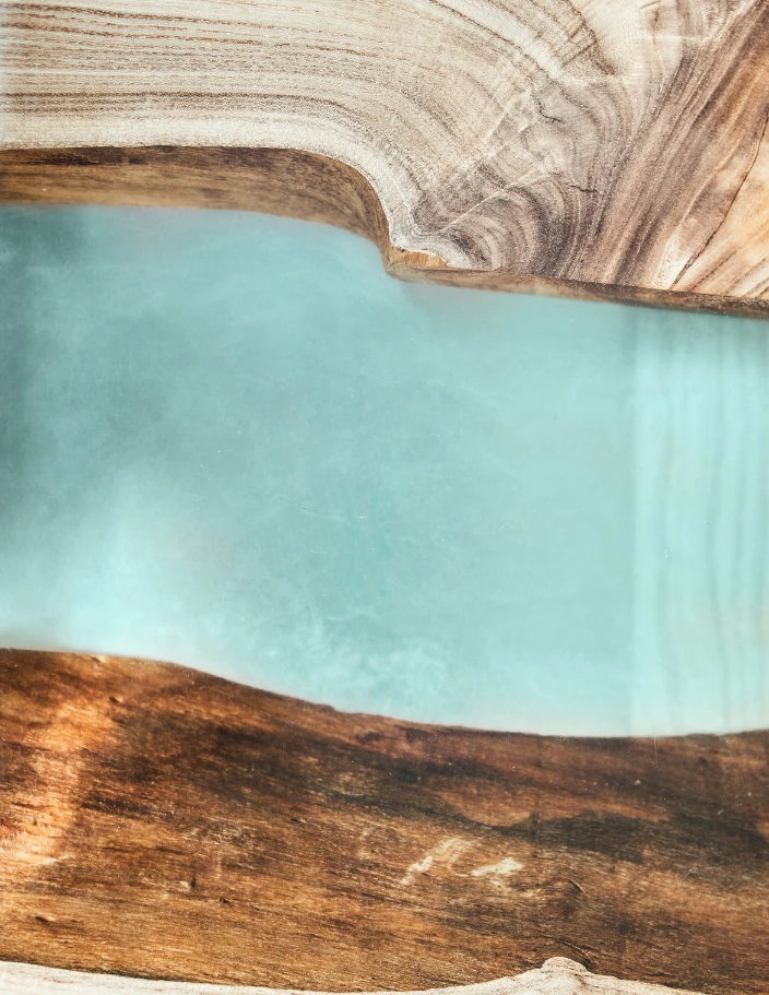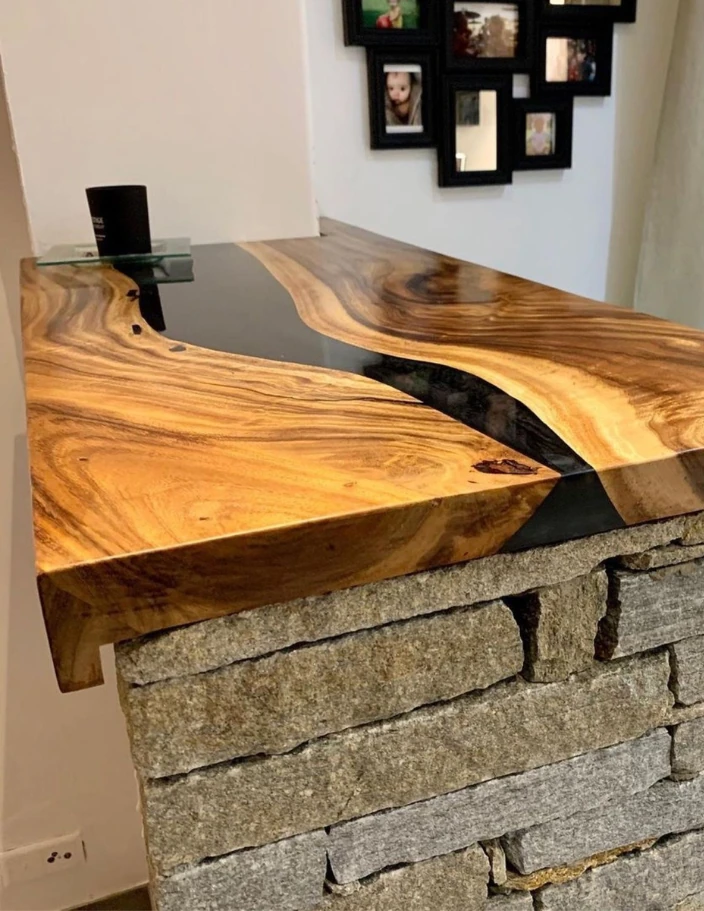 En massiv benkeplate i valnøtt eller eik er en interiørklassiker, som dekorative elementer i epoxyharpiks tilfører eleganse og skandinaviske favorittmotiver.