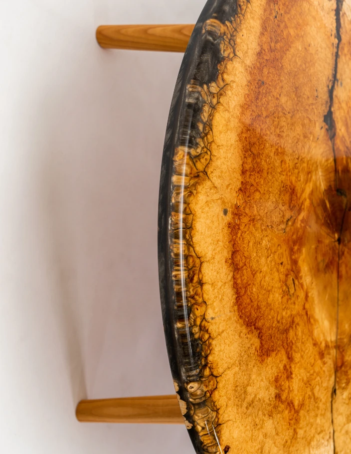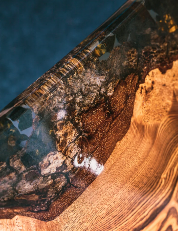 Du kan velge nyanse og farge på treverket samt epoxy, inkludert nesten helt gjennomsiktig epoxy. Dette gjør det mulig å tilpasse bordet til enhver stil og fremheve dets unike design.