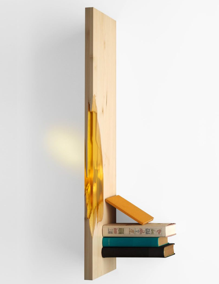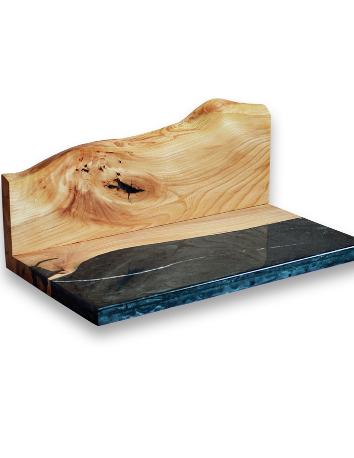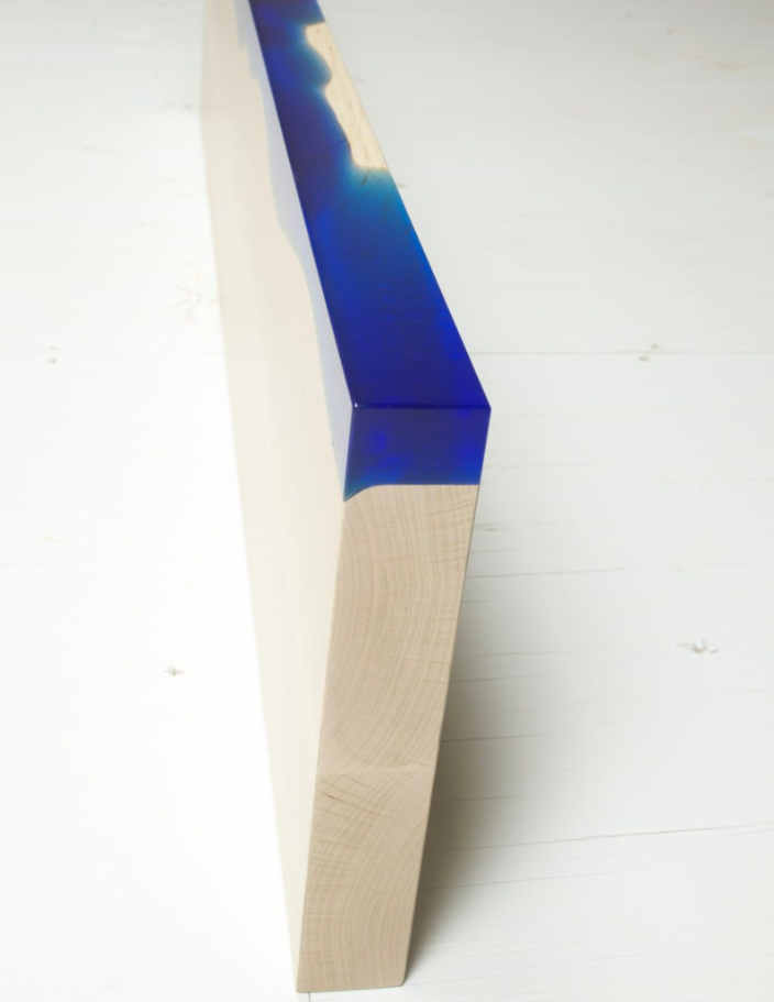 Hyllene av naturlig tre og epoksy kombinerer treets varme tekstur med epoksyens dype klarhet og glans.