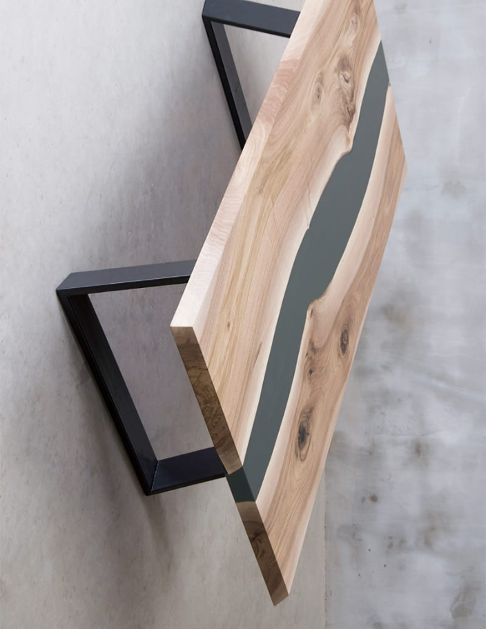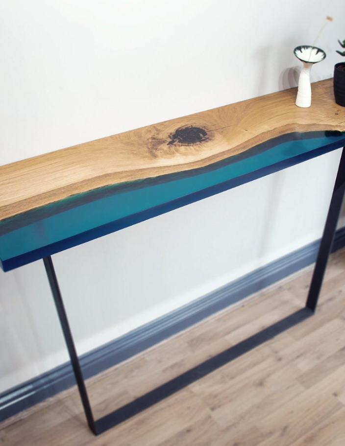 Hver hylle er unik, med naturlige mønstre og farger i treverket, mens epoksyen tilfører et moderne preg og en flytende estetikk.