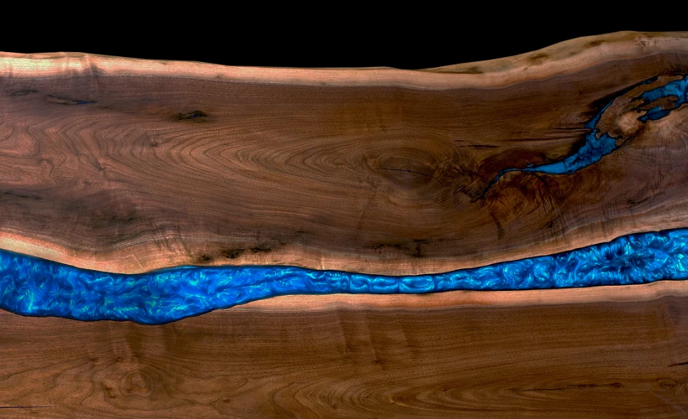 Du kan velge nyanse og farge på treverket samt epoxy, inkludert nesten helt gjennomsiktig epoxy. Dette gjør det mulig å tilpasse bordet til enhver stil og fremheve dets unike design.