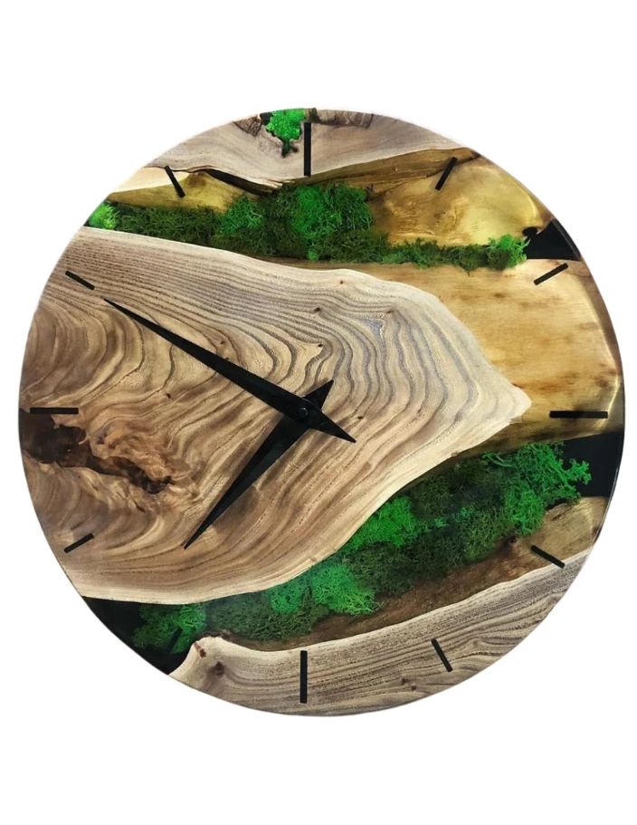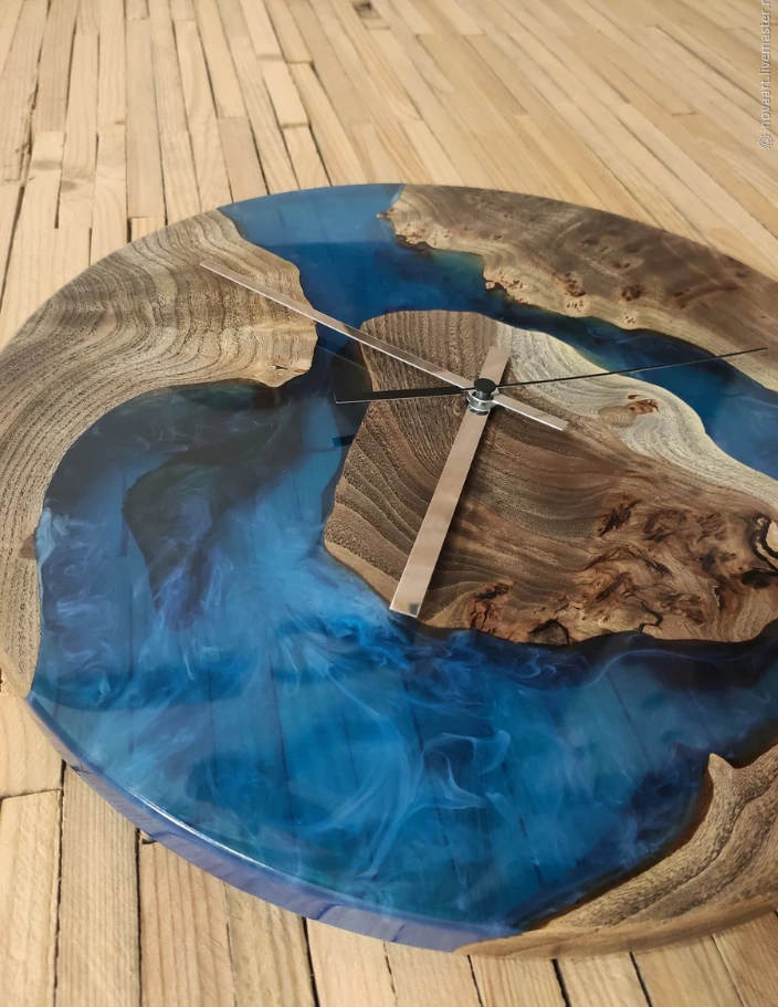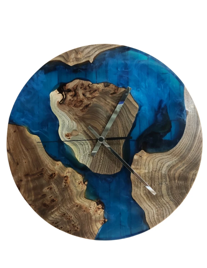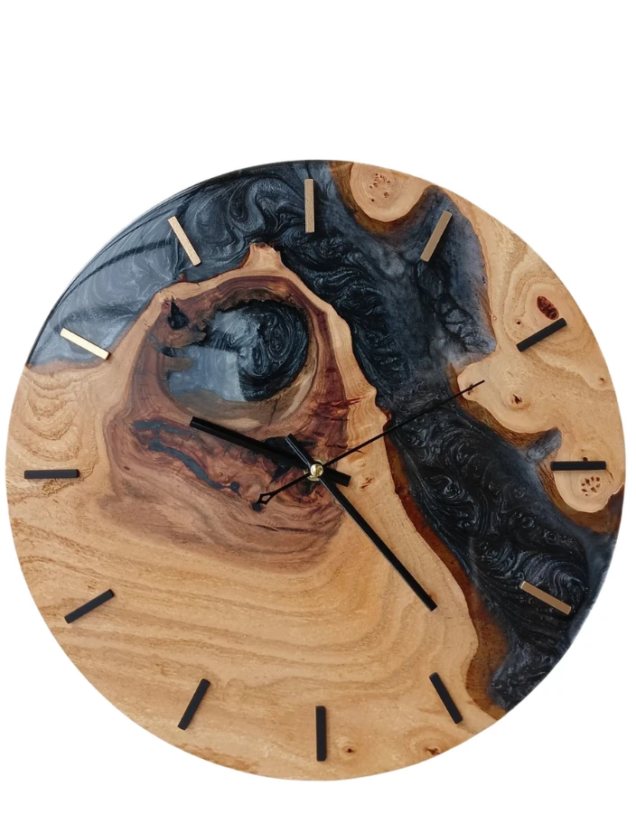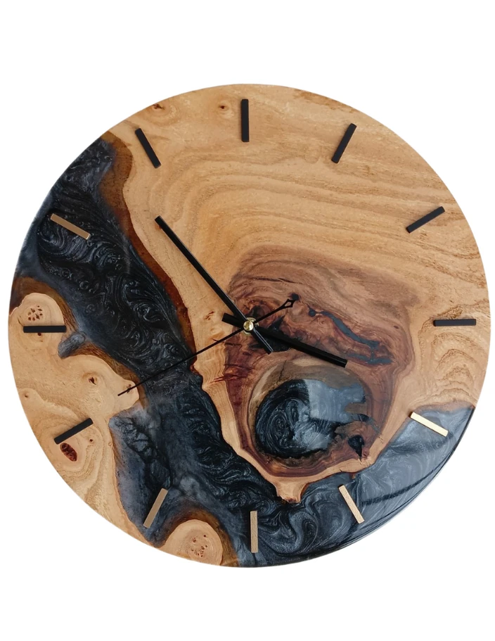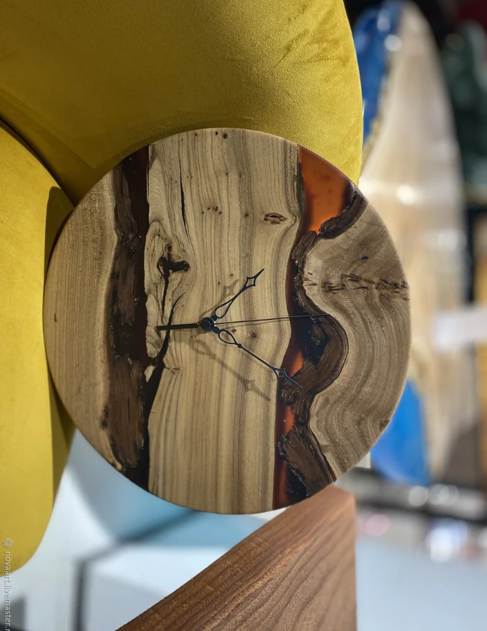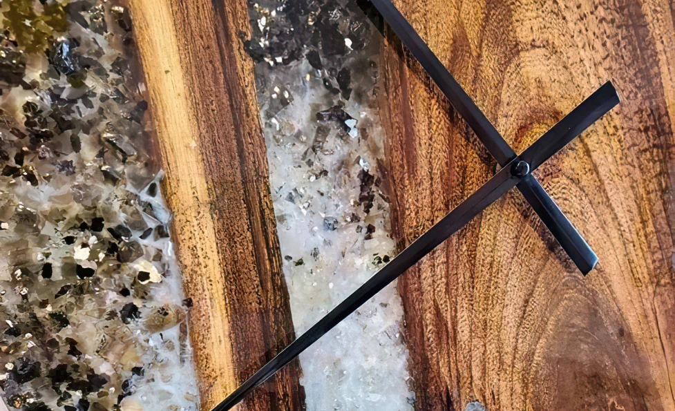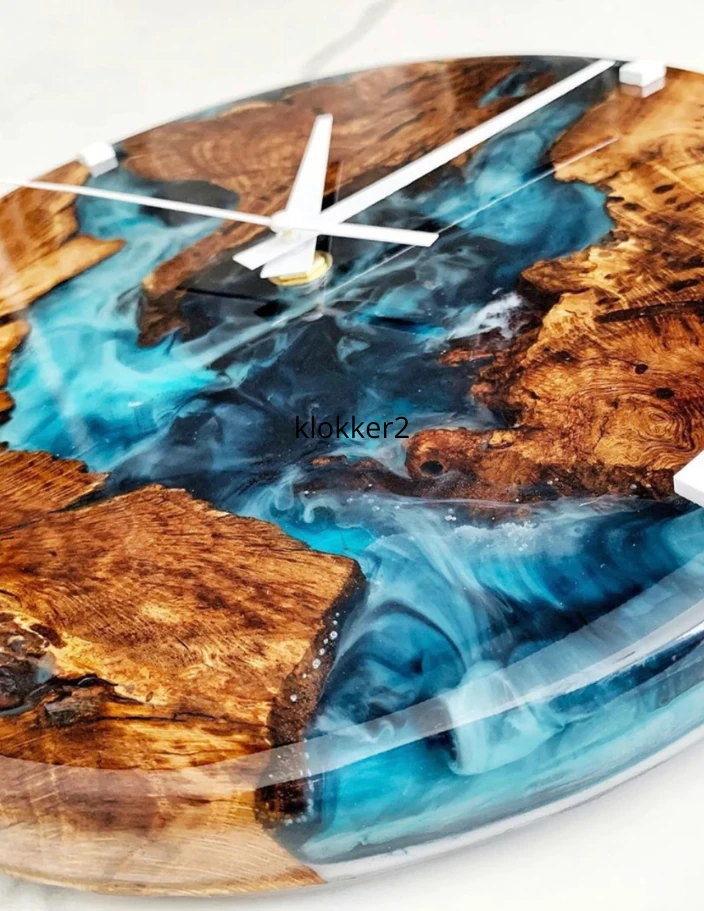 Det naturlige treverkets levende varme harmonerer perfekt med epoksyens dybde og gjennomsiktighet, noe som skaper et unikt fundament for klokken.