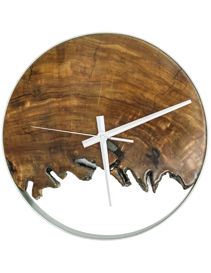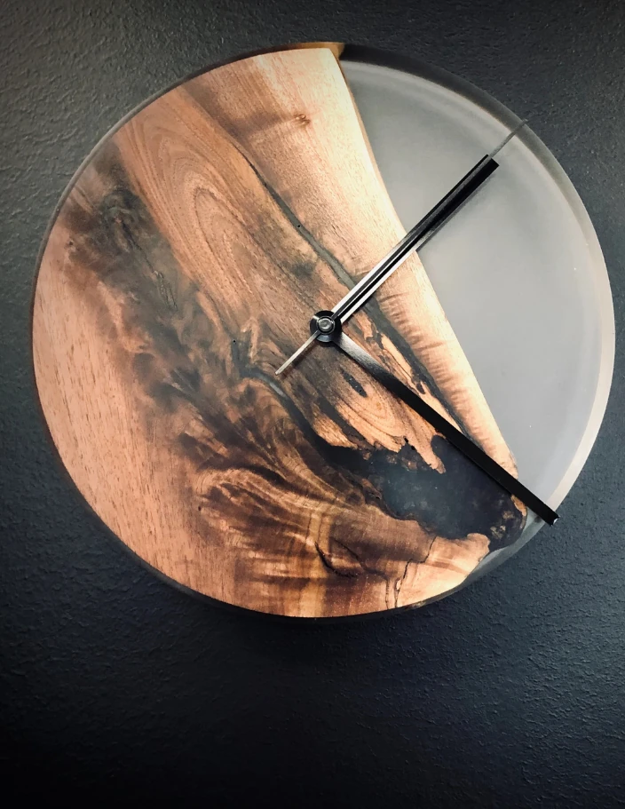 Hver klokke er en unik blanding av treets naturlige tekstur og epoksyens fengslende dybde, som minner om havbølger eller størknet lava.