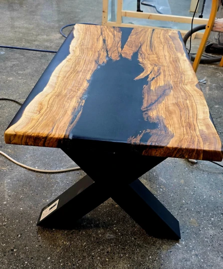 Coffee table made of olive wood with “Black Smoke” epoxy resin