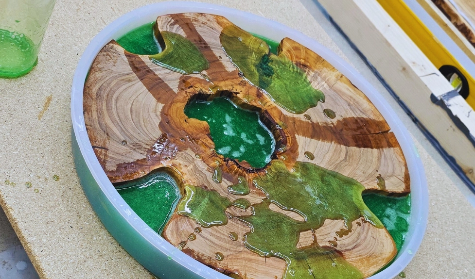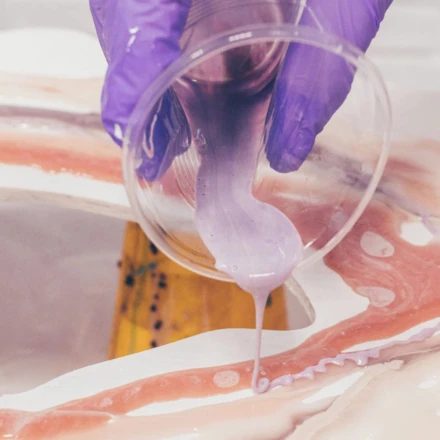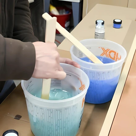 Epoxyharpiks herder når de to komponentene blandes. Det er viktig å bruke alle nødvendige materialer i riktig mengdeforhold. Hvert trinn i produksjonen kan dokumenteres på video, slik at nye håndverkere kan følge instruksjonene hvis de lurer på noe. Riktig blandeteknikk er avgjørende for å oppnå et vellykket resultat